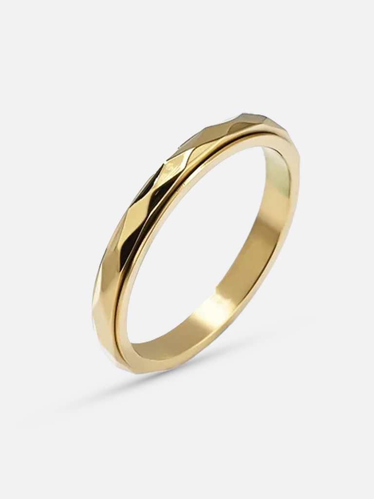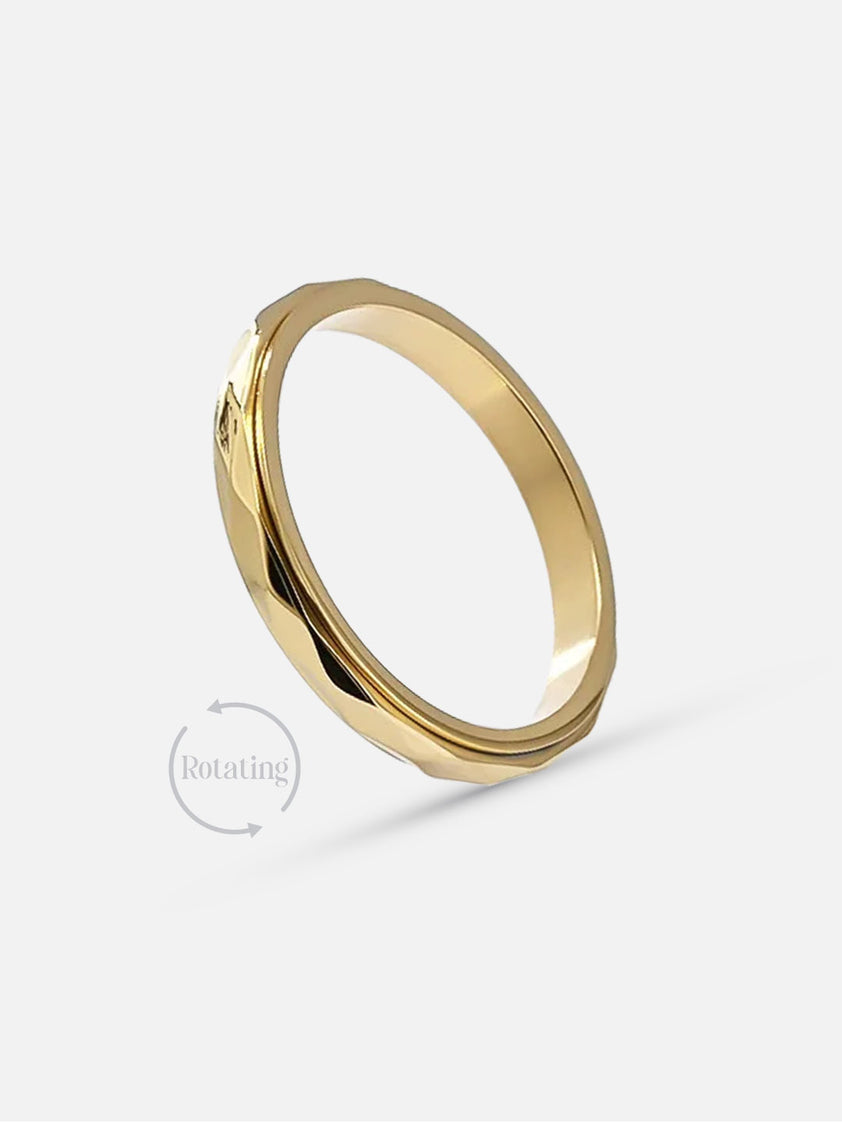 A sleek unisex gold ring with a smooth spinning band — designed to ease nervous energy, help stop biting or fidgeting, and bring calm through motion.