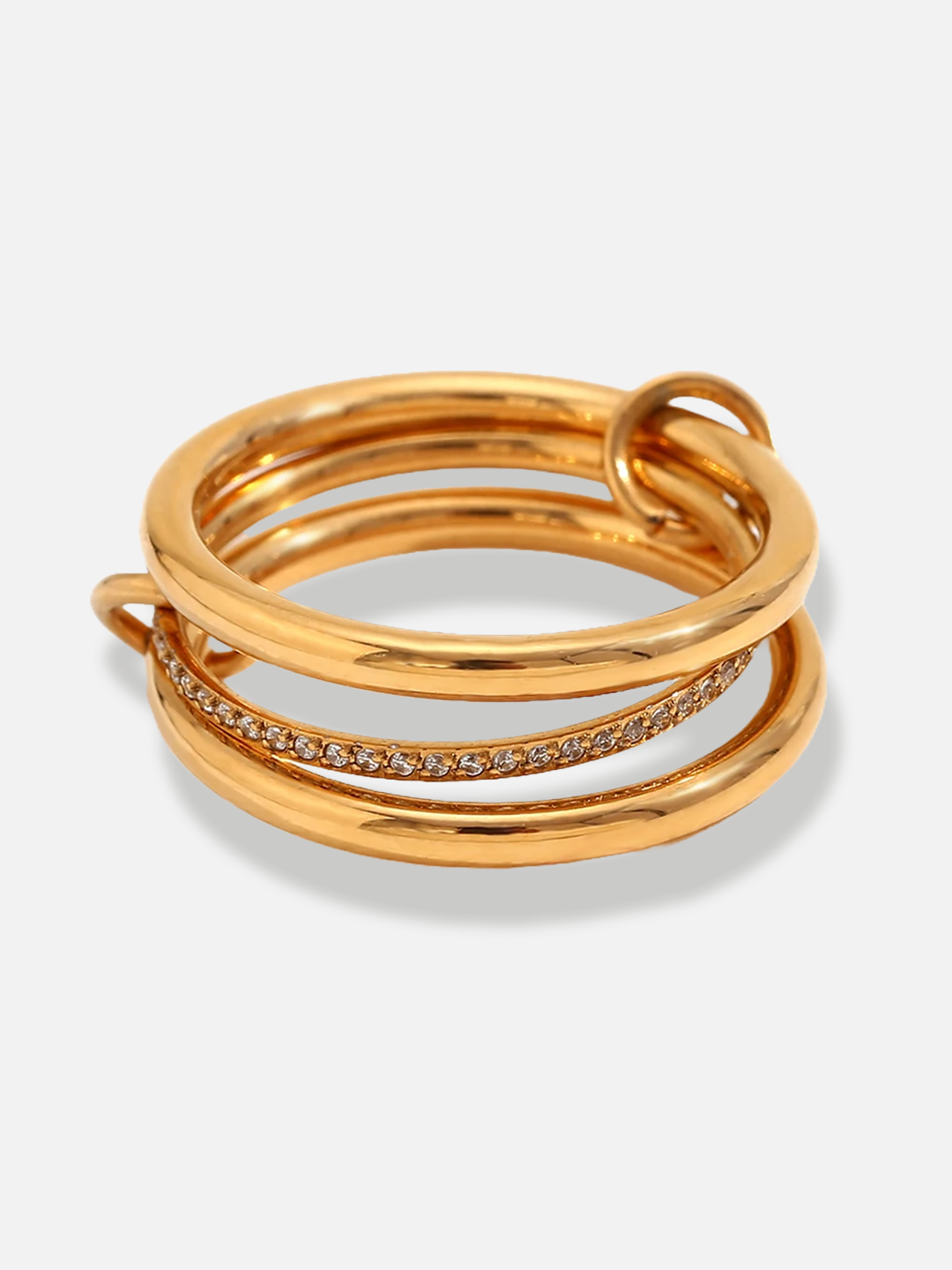 The SAINT TEMPO Gold Linking Ring moves with you — three gliding bands that ease stress and calm anxious hands in quiet rhythm.