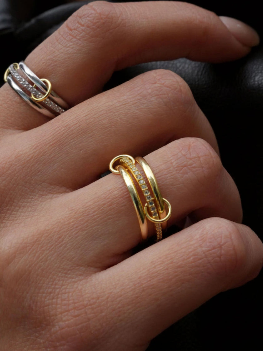 The SAINT TEMPO Gold Linking Ring is designed to move with you — its three interlinked bands glide smoothly with every touch, offering a subtle way to ease stress, calm anxious hands, and find rhythm in motion.