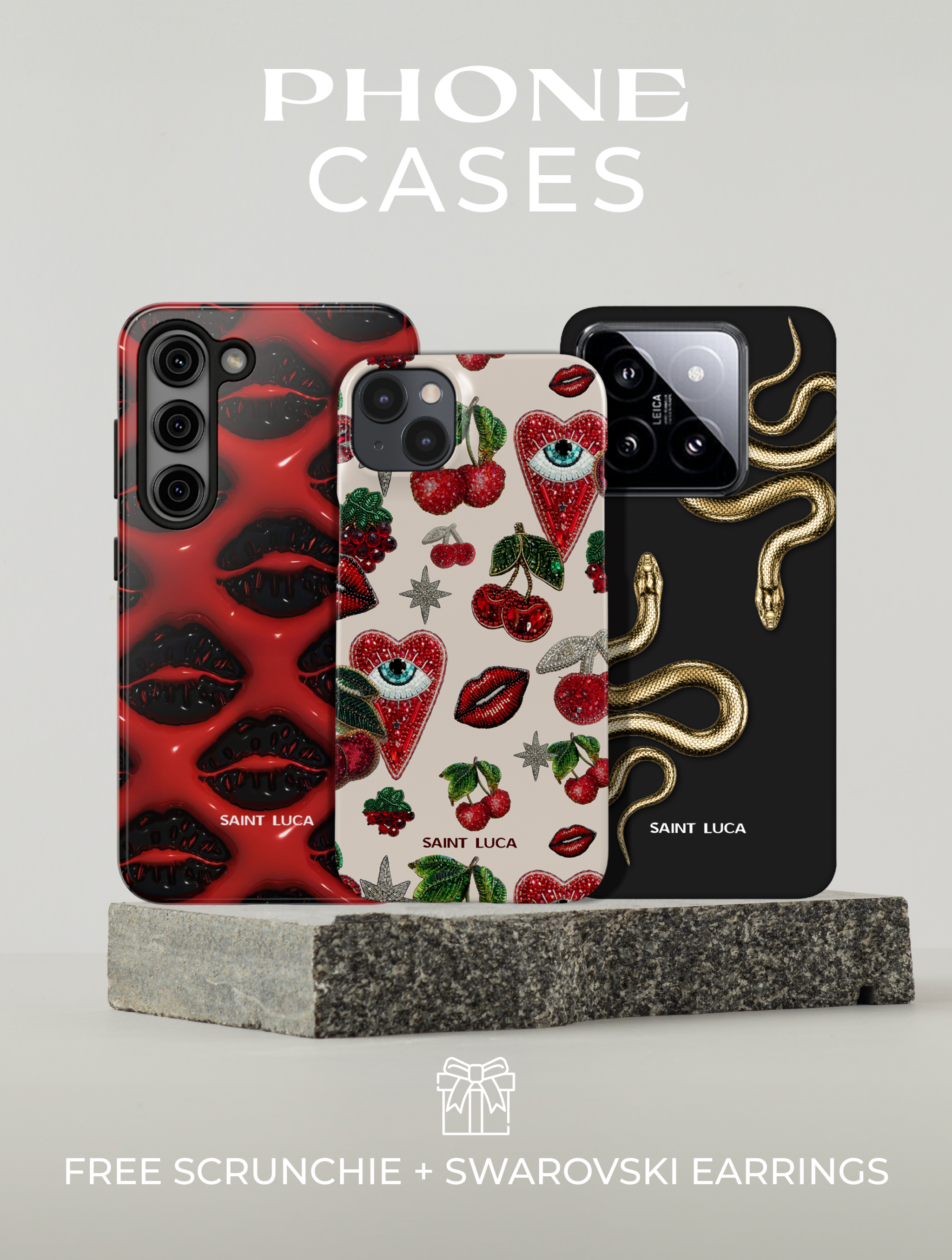 Transform your phone into an eye-catching high-fashion accessory. Inspired by the confident femme fatale, this design ensures you look not just stylish but exceptionally unique. More than just a fashion statement, it offers high-quality protection for your phone, guarding against bumps, scratches, and cracks. Saint Luca's original prints are crafted to make you stand out—bold, artistic, and uniquely yours. Elevate your style with designs that are anything but ordinary. Complete the look with a matching scrunchie and scarf in the same captivating print!