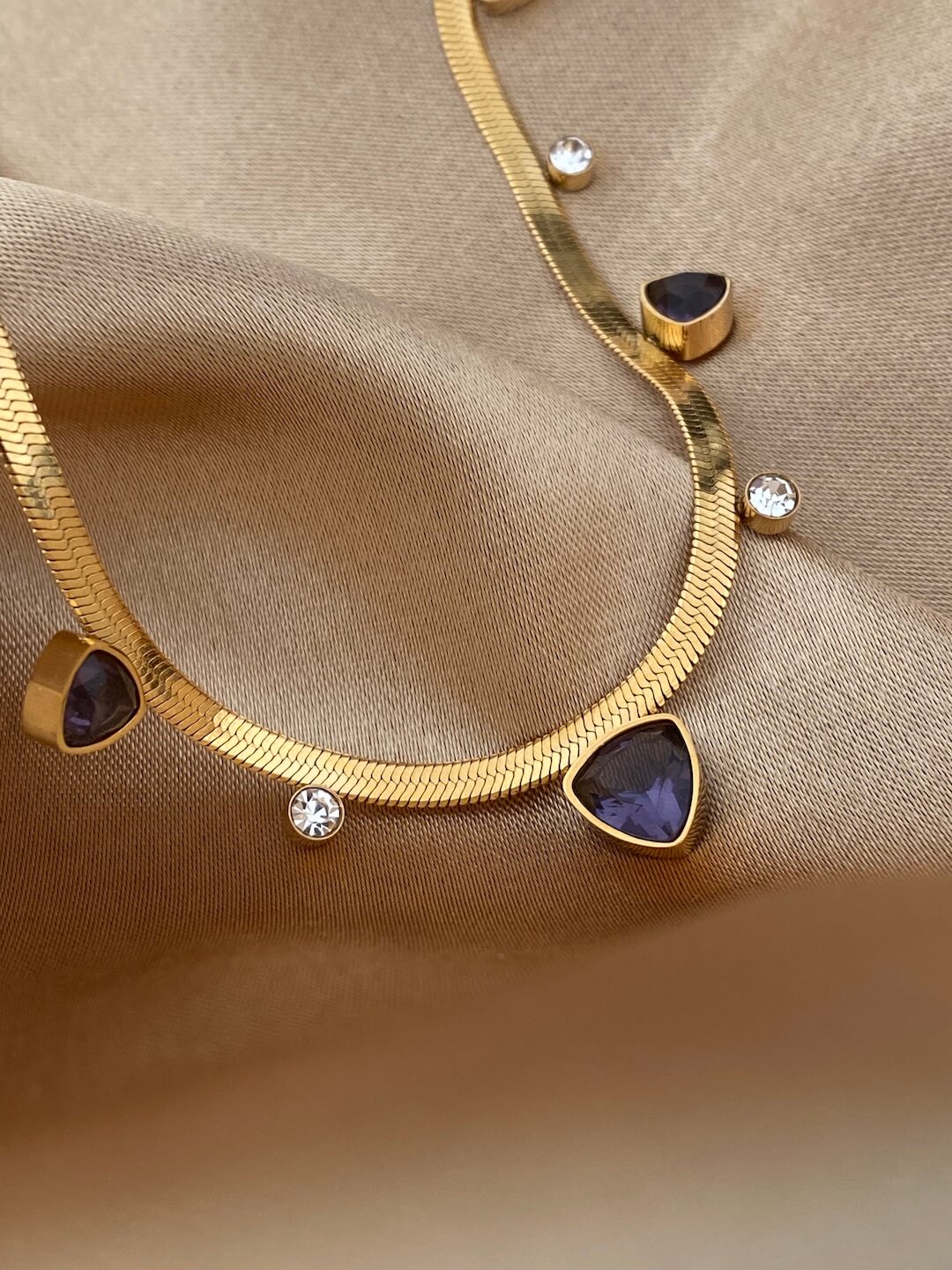 2 necklaces set features a waterproof polished gold herringbone and bold Cuban link necklace with subtle blue crystals.