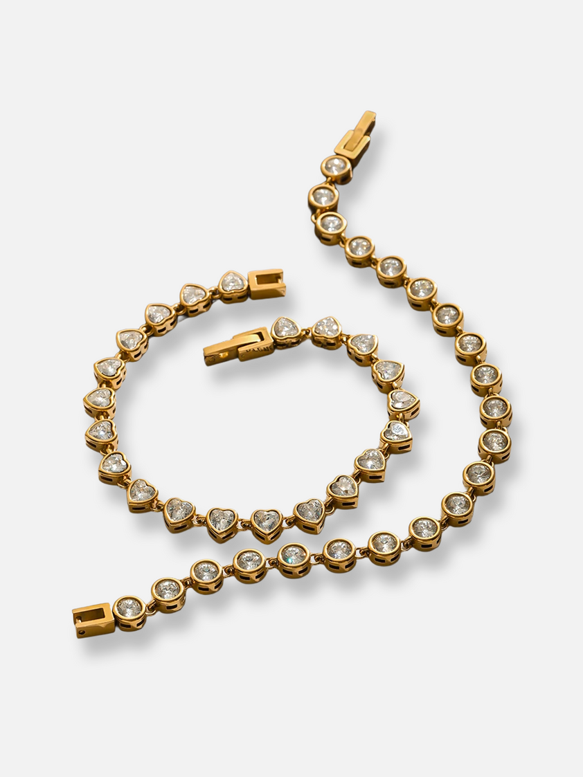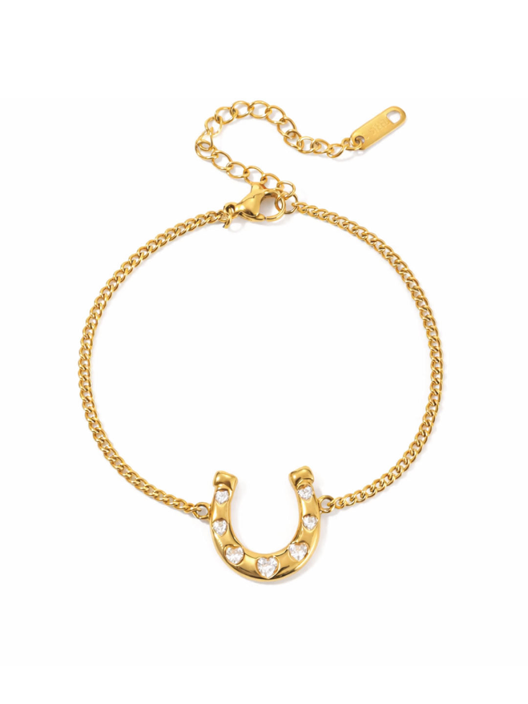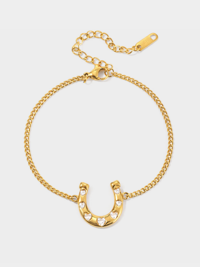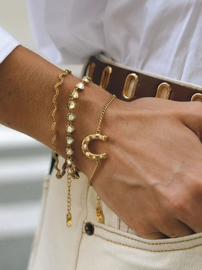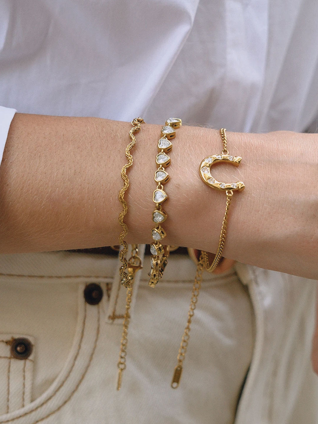 The set features a fluid chain bracelet for effortless movement, a heart-cut stone tennis bracelet that adds subtle brilliance, and a signature horseshoe-shaped charm symbolizing luck, strength, and timeless elegance. Balanced, polished, and versatile — this trio elevates everyday styling with quiet confidence.